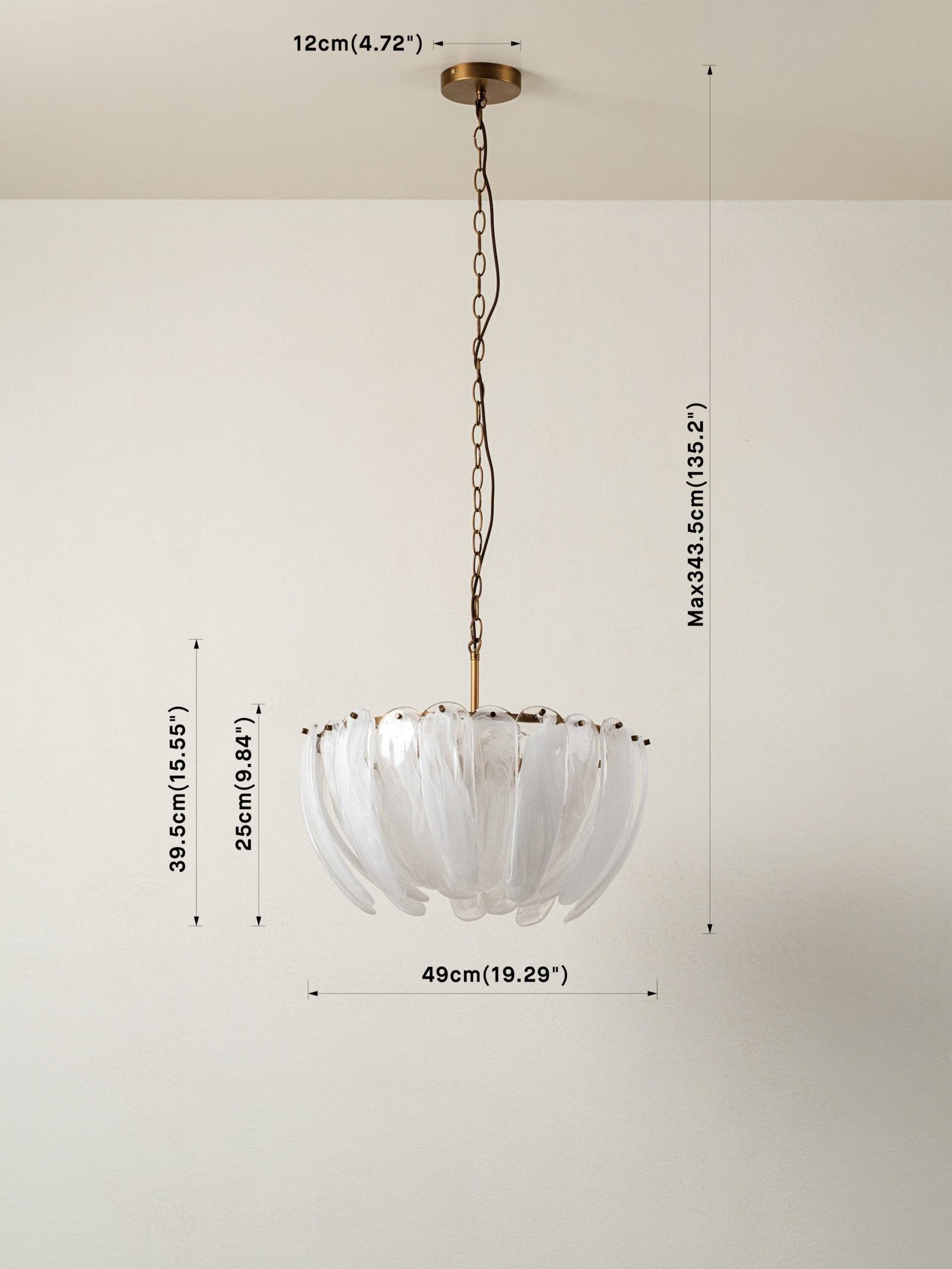 The Astera chandelier is a beautifully elegant pendant. designed to mimic an opening daisy. Each of the 22 hand made glass petals are swirled with white and layered to create a relaxed and natural formation. Circling our signature aged brass frame and hung by up to 3 meters of chain and chocolate fabric cable. the Astera adds a subtle statement to any living or bedroom design.
