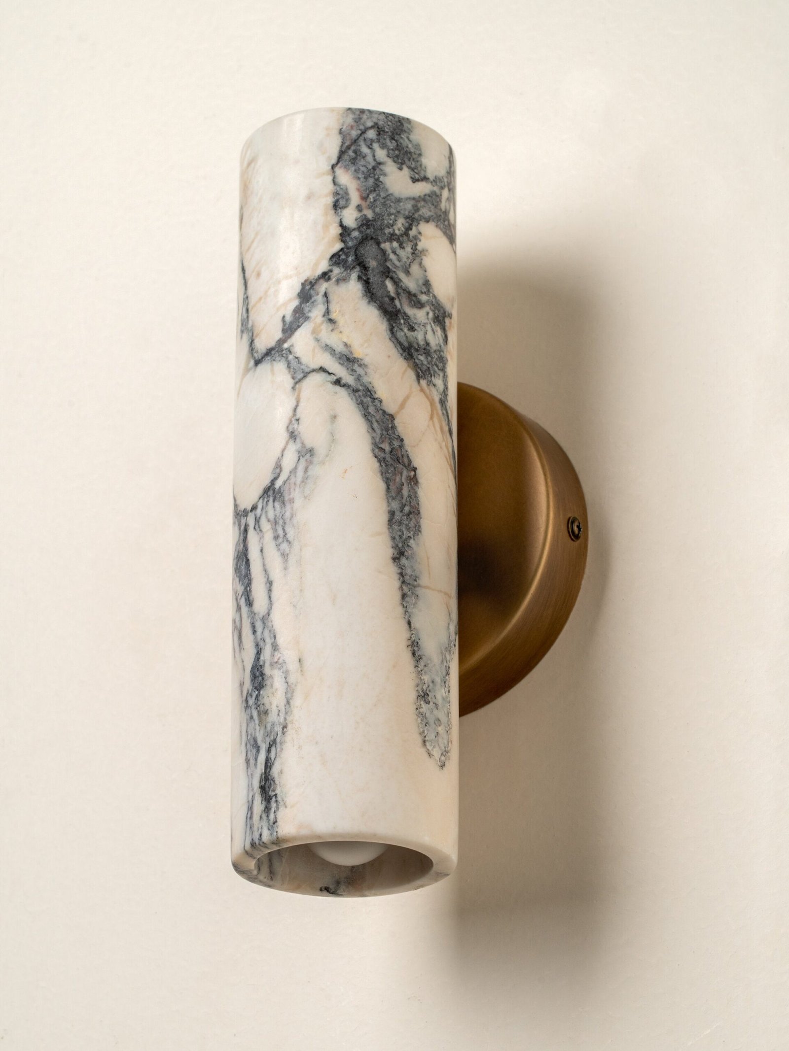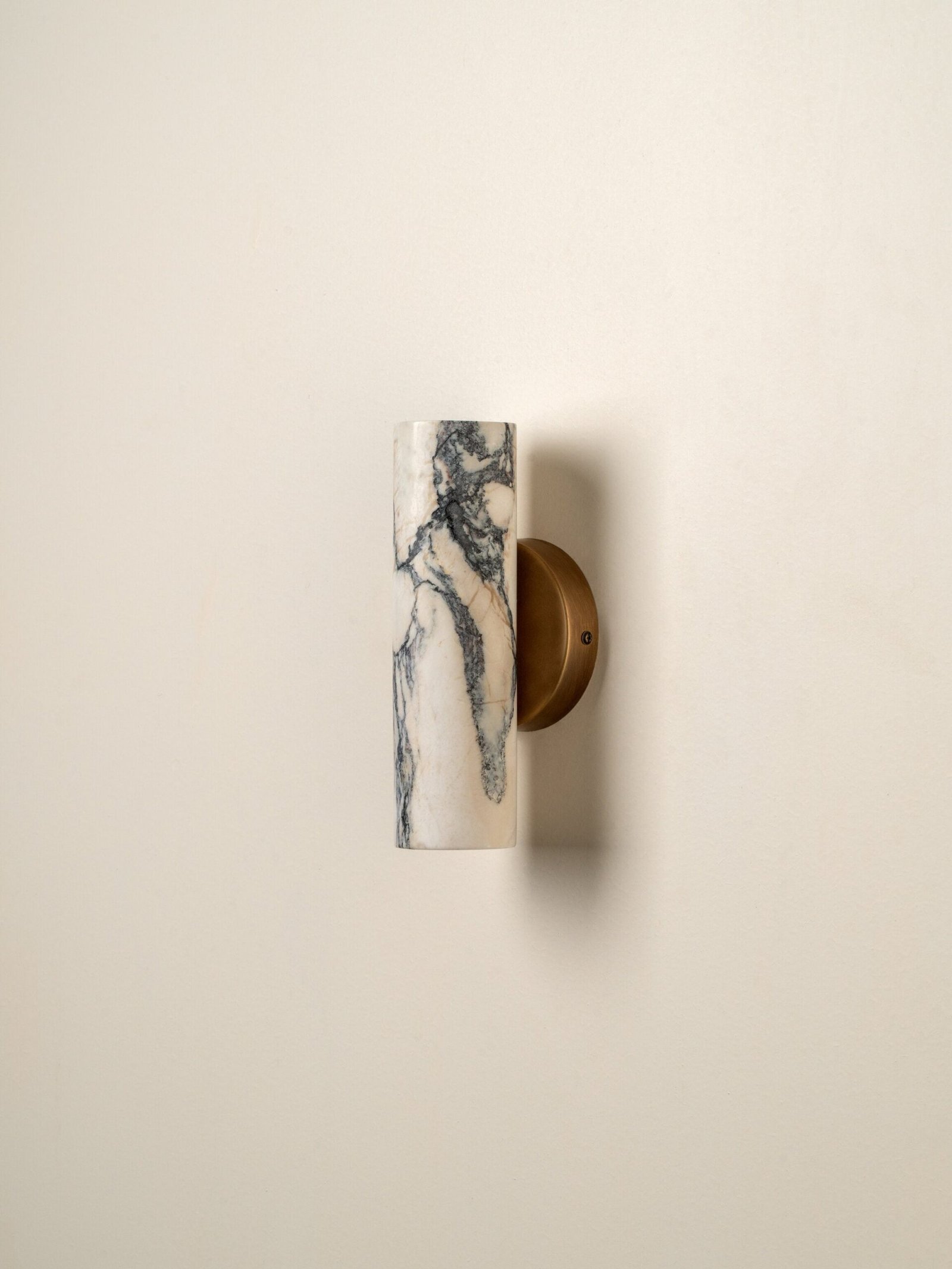 We designed the Calla wall light to be as simple as possible to ensure sure the marble did all the talking. The veining and colour variance of the Italian viola calacatta is well known and well loved. We have simply used it to compliment a bathroom or kitchen counter. to showcase the stone and to emphasise all that is beautiful. especially when lit from within. We recommend the Calla is positioned as an ambient up and down wall washer.