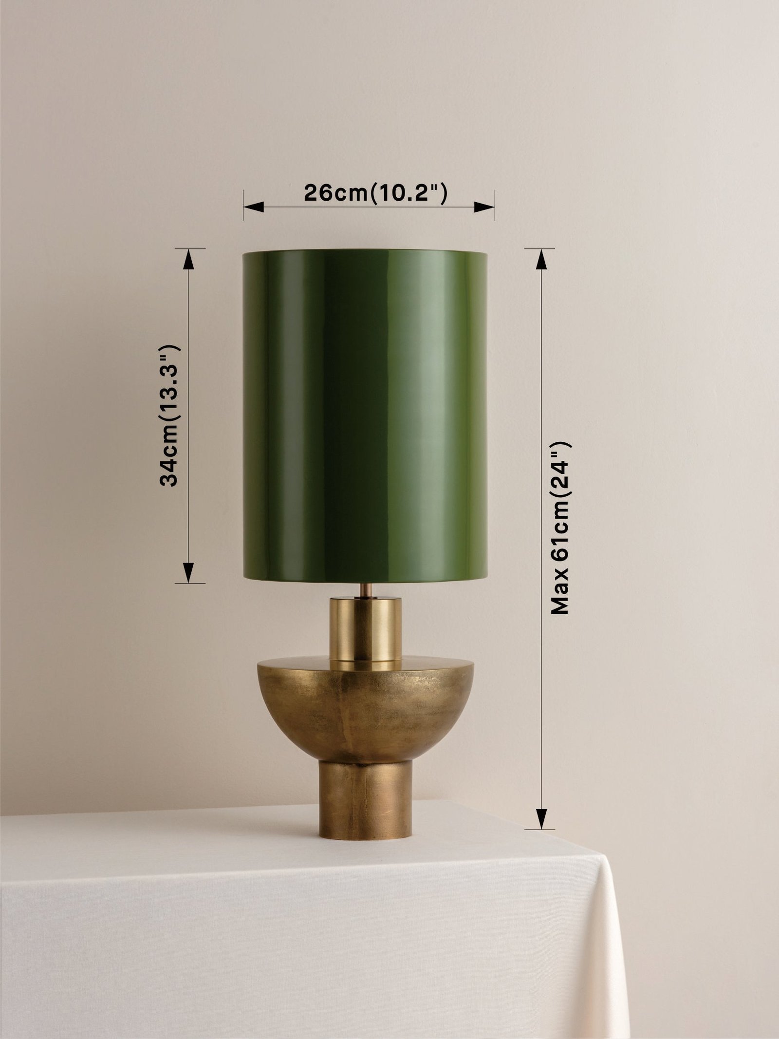 This combination comprises of: Base = Cast from real brass. Shade = Expertly coated with a deep green lacquer.