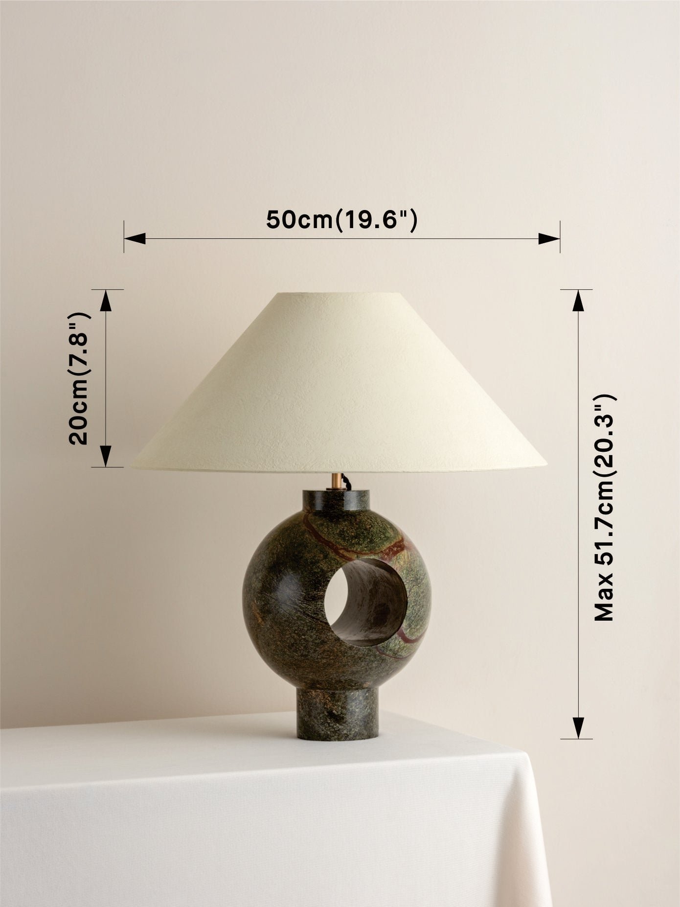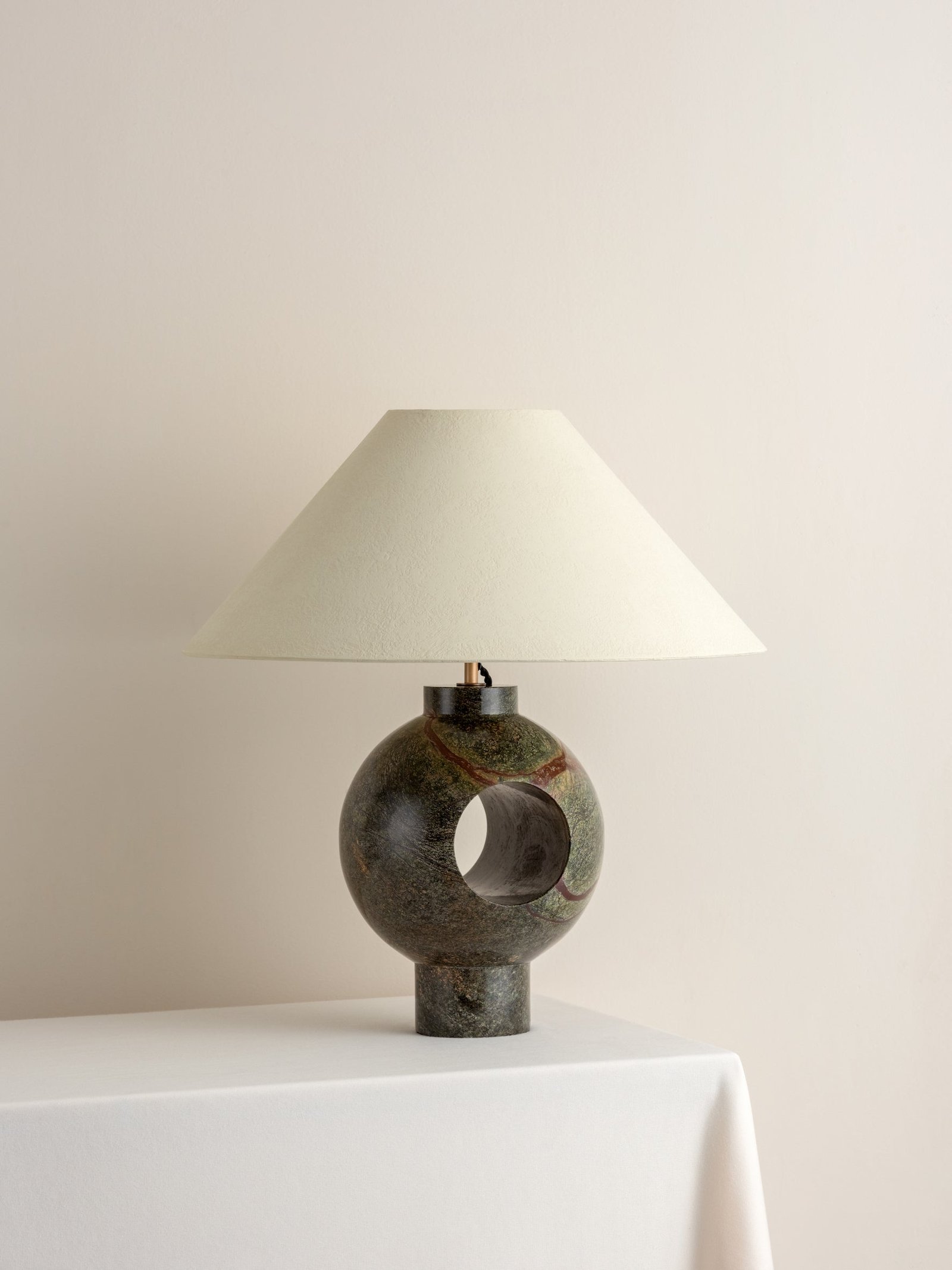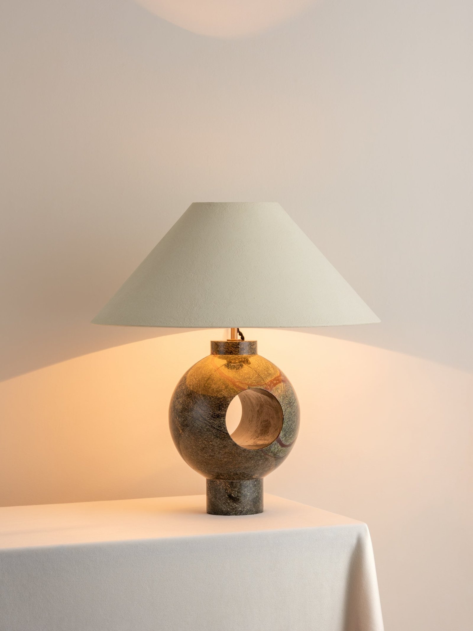This combination comprises of: Base = Italian green marble. Shade = Warm white plaster.
