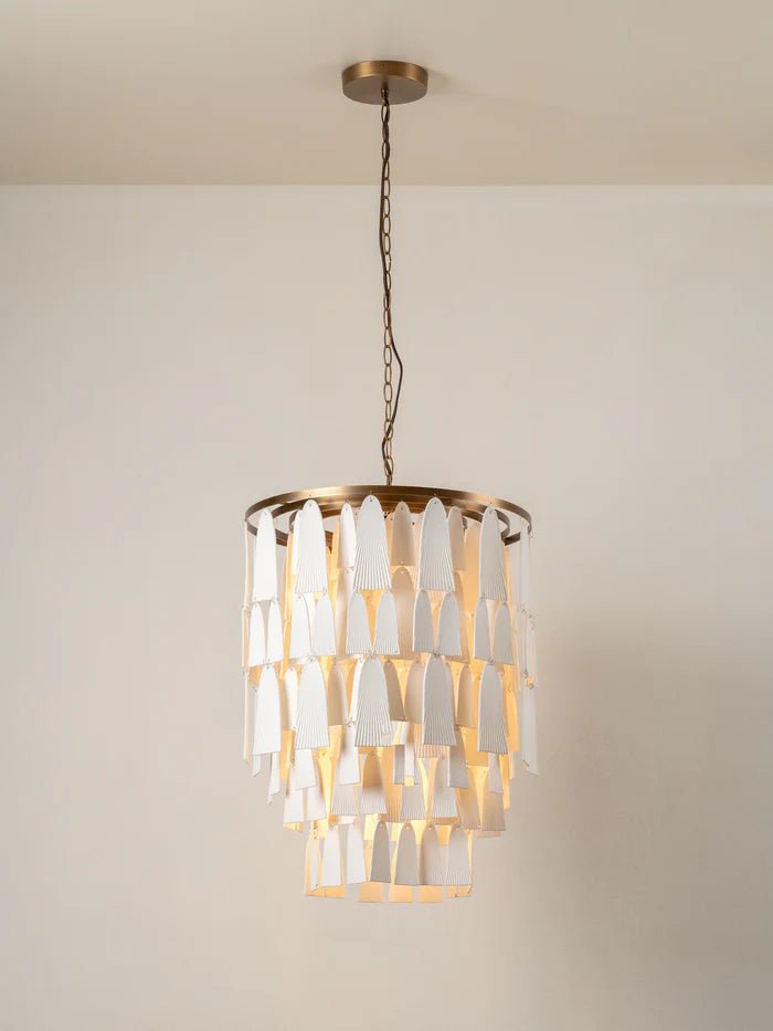 A stunningly organic style chandelier. 4 tiers of textured porcelain seemingly float around the central light creating layer upon later of warm natural tones. 243 varying sizes of fluted porcelain drops create a feathered effect which look simply beautiful by night and as light as a wind chime by day.