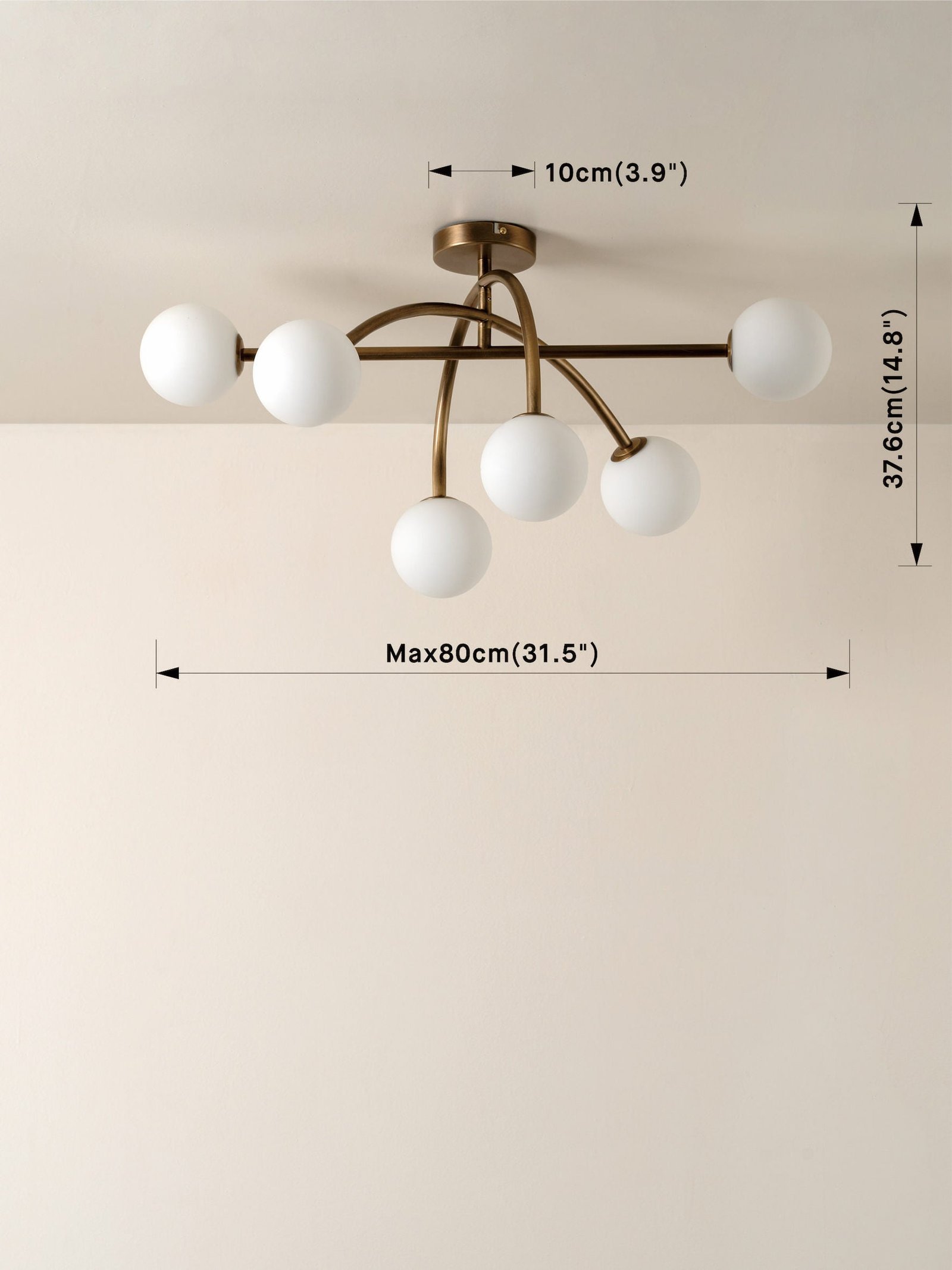 Striking and sophisticated. The Perry ceiling pendant boasts six elegantly curvaceous arms expertly crafted from light aged brass. exuding a sense of refined beauty. Crowning each arm is a frosted opal globe providing a soft and diffused illumination that bathes a room in a warming glow. The protruding arms ensure even light distribution – a versatile option for an array of interior styles or building types without overbearing a scheme.