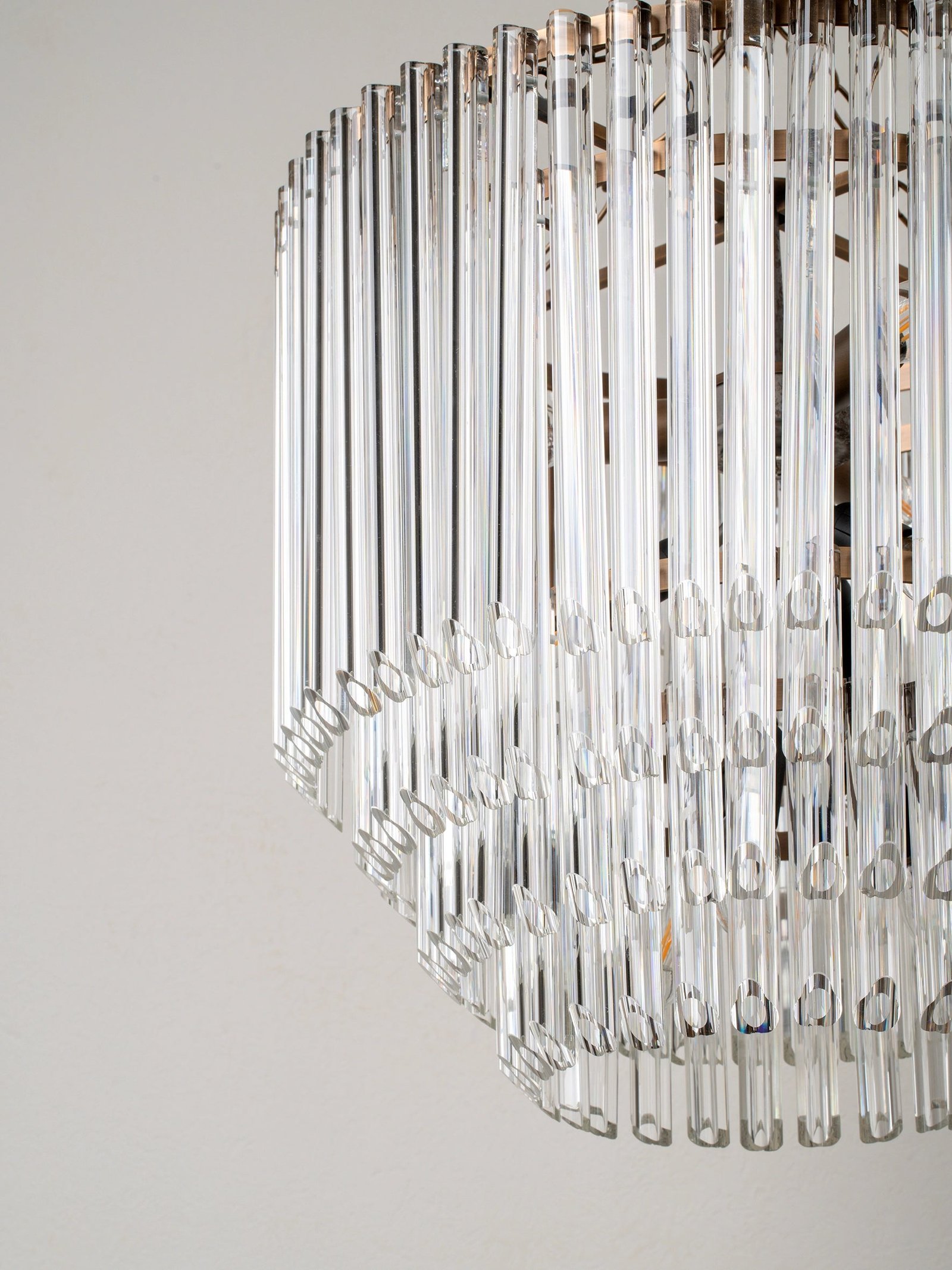 The Petalia is a contemporary update to a classic chandelier. Made up of 160 hand polished clear scalloped glass drops. elegantly cut to accentuate the petal like shape across all four tiers. 5 lights illuminate and refract through the shaped glass. creating glamorous flares and reflections. Care and attention has been paid to every element of this opulent chandelier: our signature aged brass finish has been applied to a frame expertly cut to ensure assembly is as easy as it is on the eye. Designed to suit any interior from mid-century villas to Victorian town houses; the Petalia chandelier is as diverse as it is timeless.