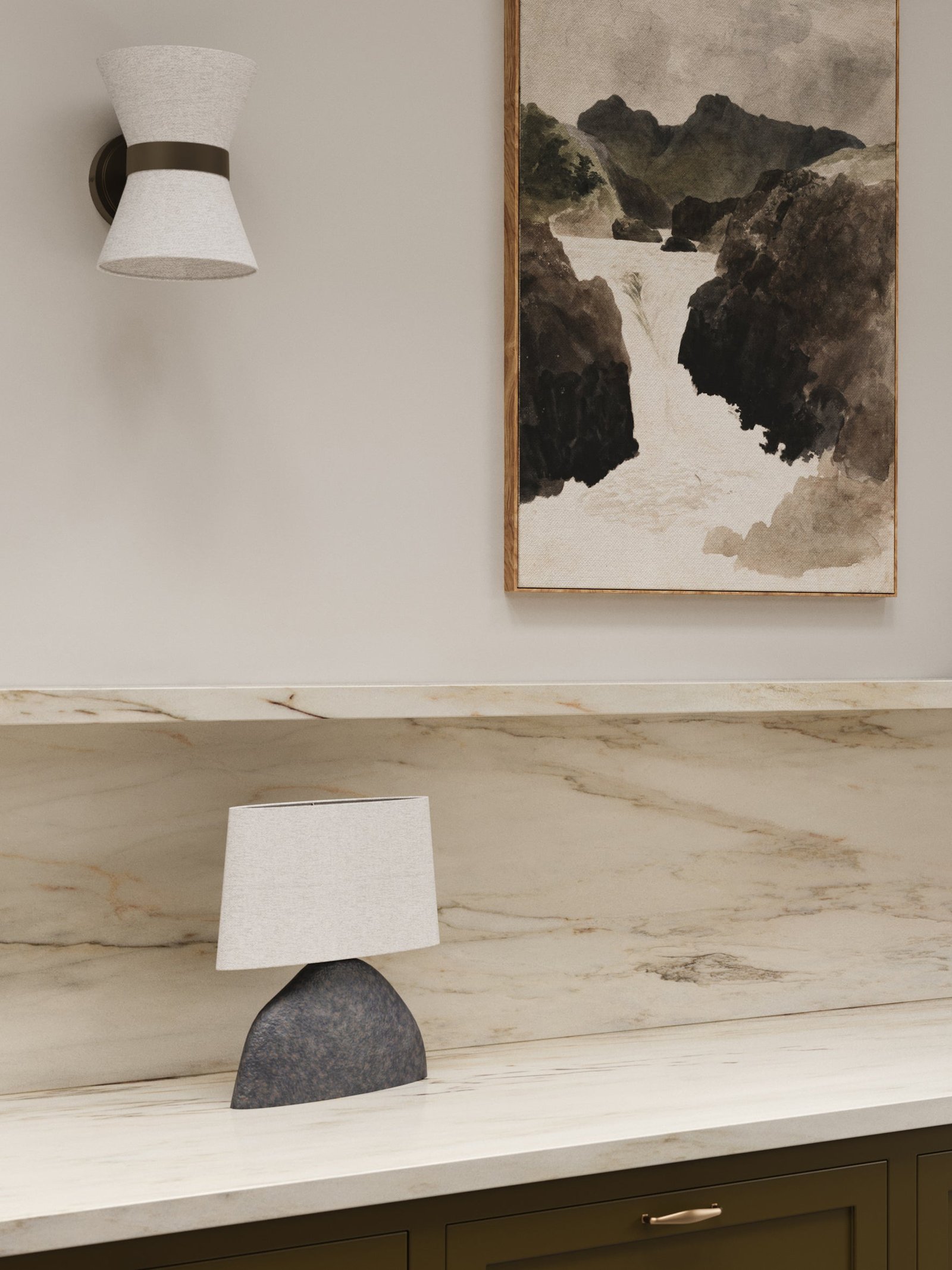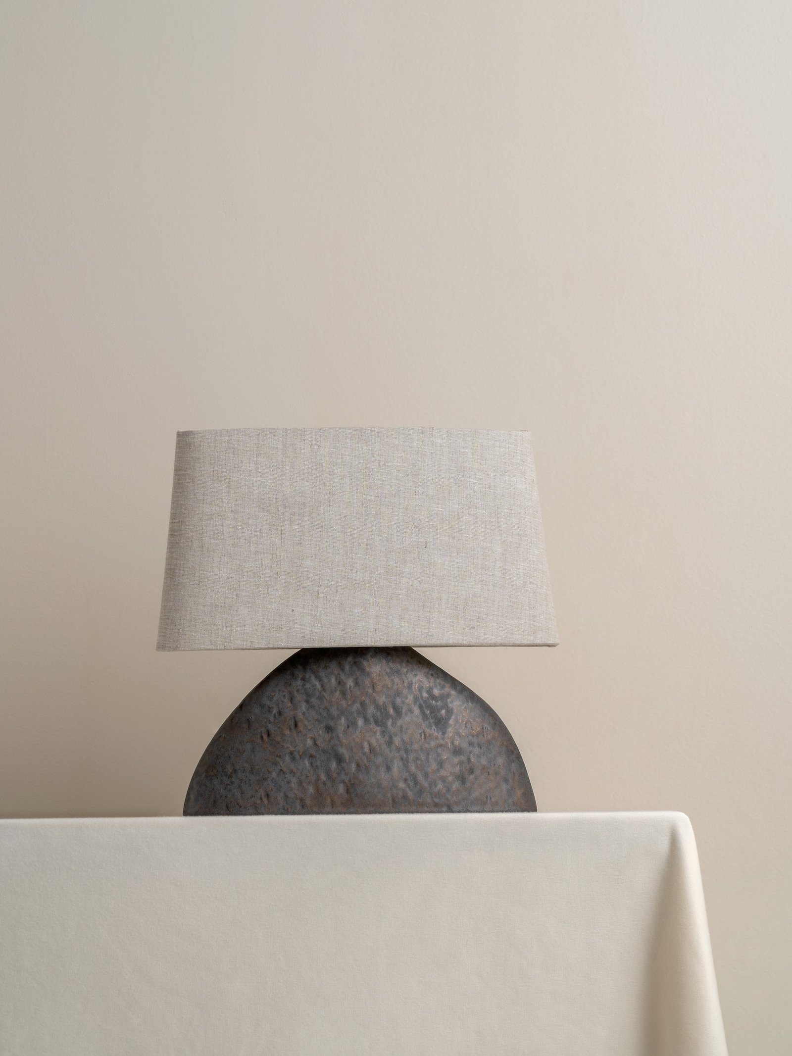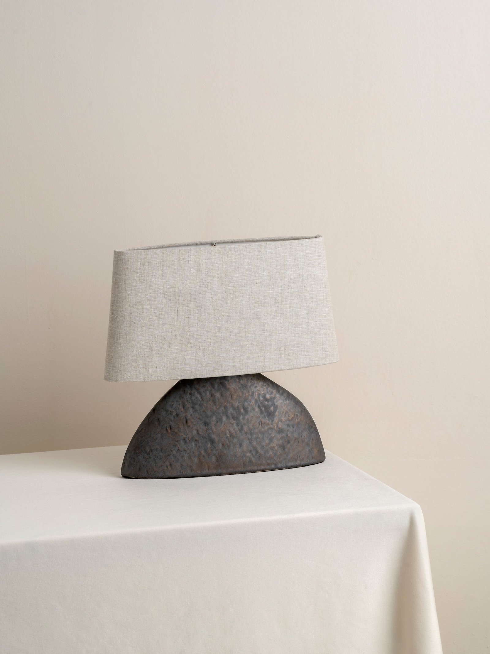 Simplistic yet extraordinary. The Pitti table lamp is a celestial masterpiece that channels the wonders of the cosmos. Featuring a sinuous bronze ceramic base and complemented with a symmetrical linen shade to diffuse an ambient glow.